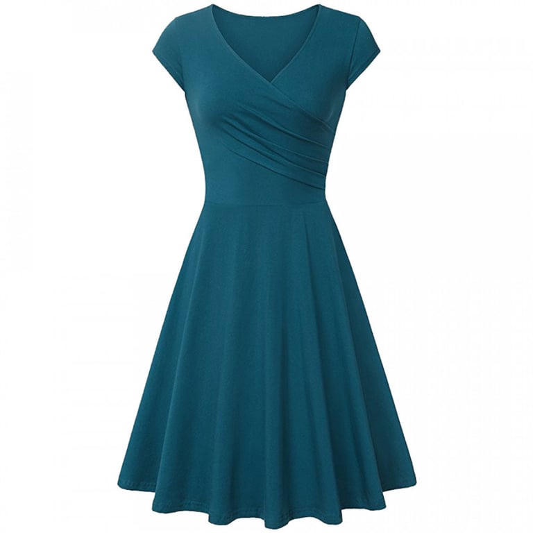 Women's dress with a wrap V-neck and short sleeves. Elastic waist with an A-line long skirt. Available in multiple colour options.