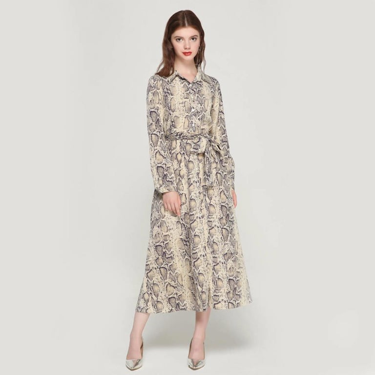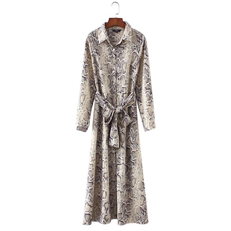 Women's dress with long sleeves and a collar. Long loose fit with a tie at the waist. Available in two pattern options.