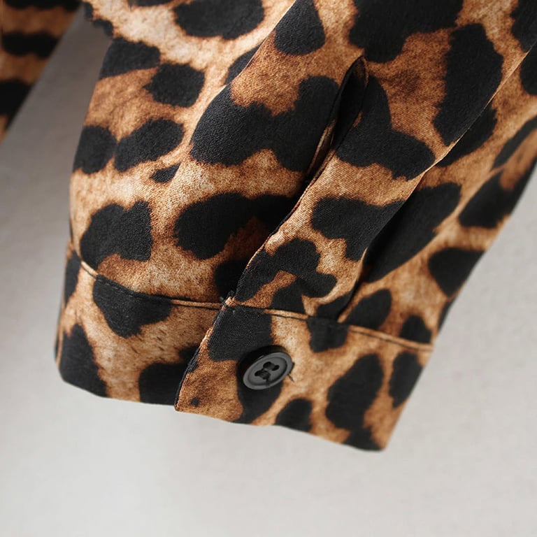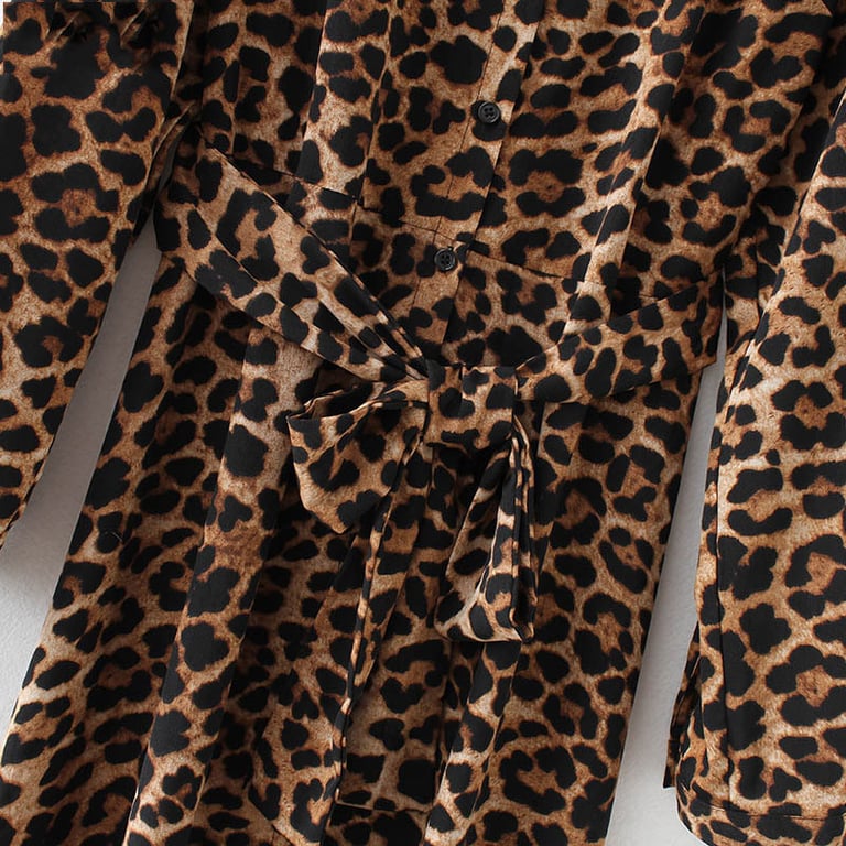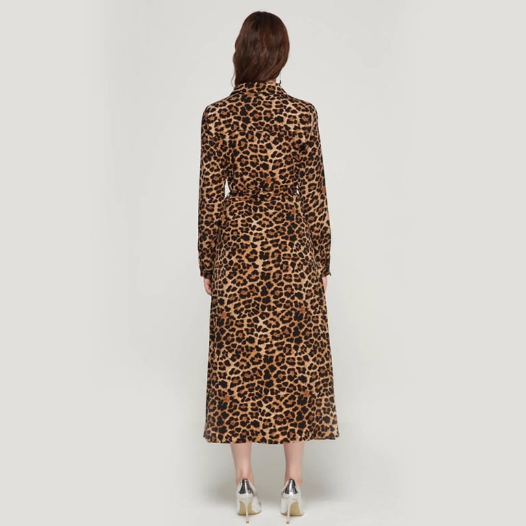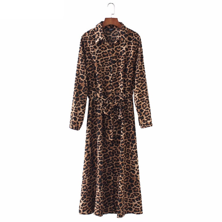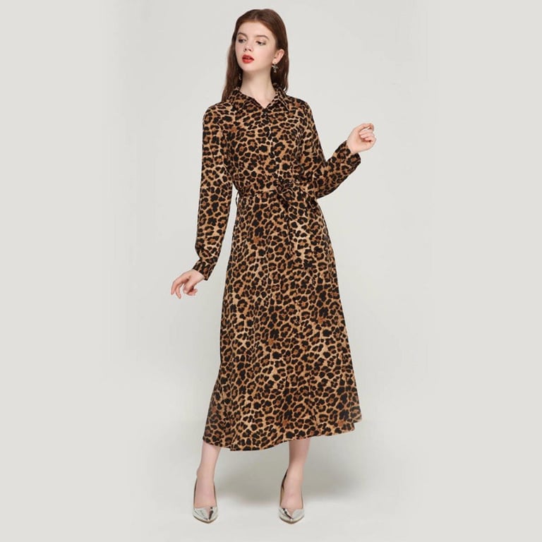 Women's dress with long sleeves and a collar. Long loose fit with a tie at the waist. Available in two pattern options.