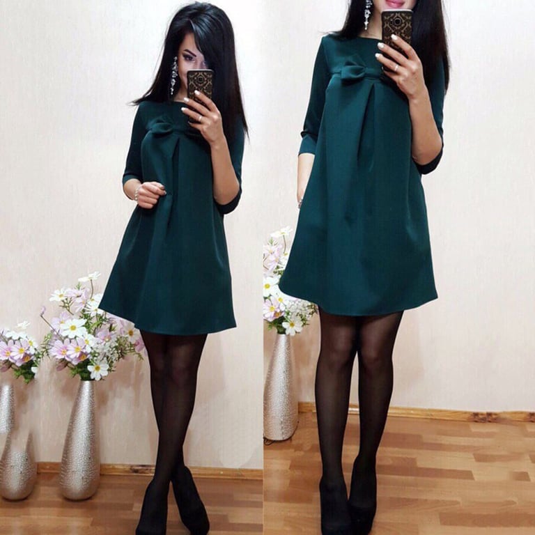 Women's short loose-fitting dress. The dress features 3/4 sleeves, a round neckline, and is adorned with a bow on the chest. Available in several colours.