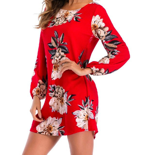 Women's stylish dress with a floral pattern. The dress has a short loose fit and a back neckline with a tie. Available in multiple colour options.