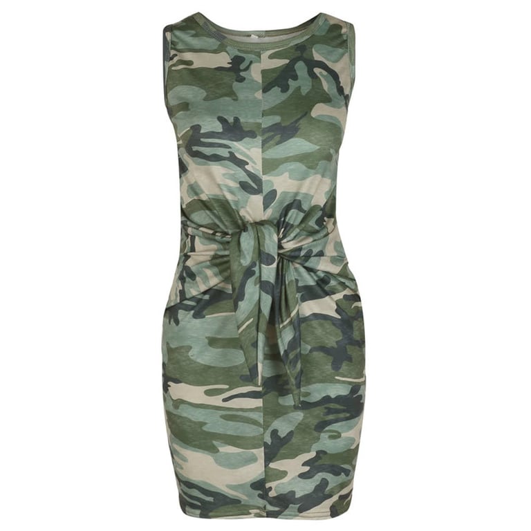Women's short dress with a knot detail at the waist. Sleeveless with wide straps and a round neckline. Printed with an army motif.
