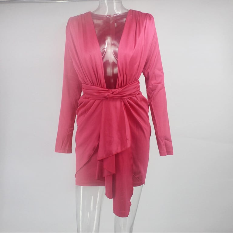 Luxurious women's mini dress with a deep neckline made from smooth, shiny material.