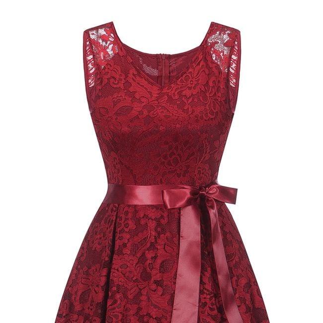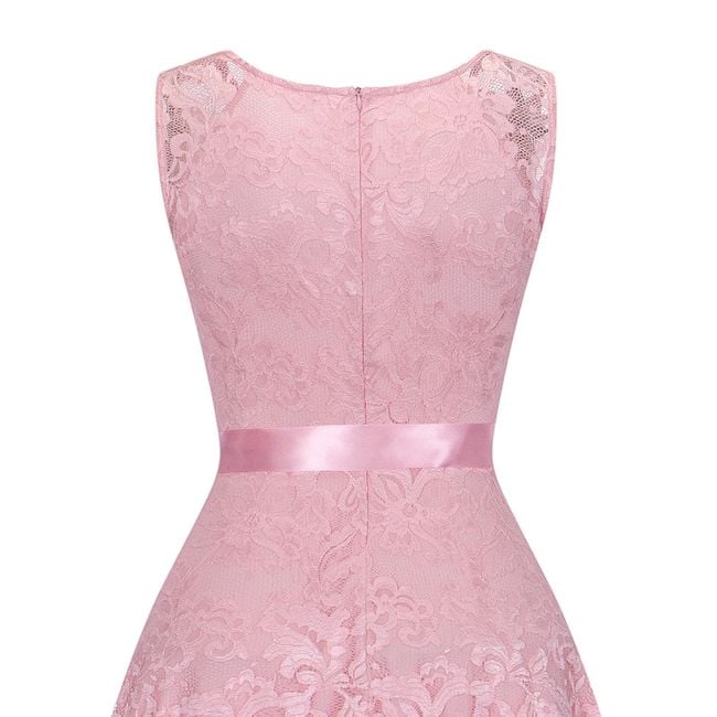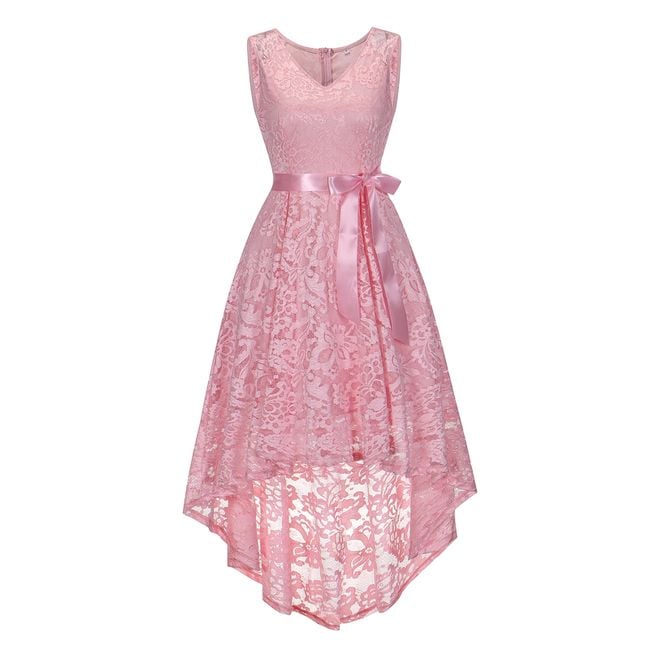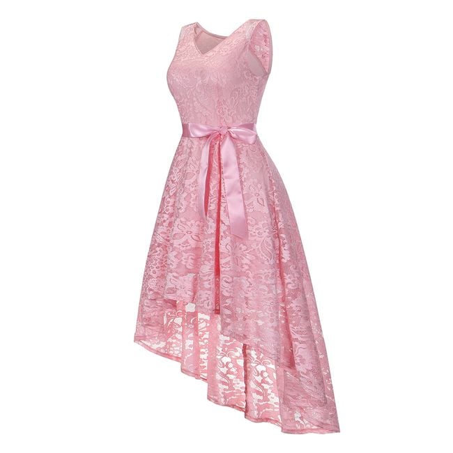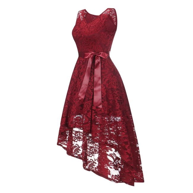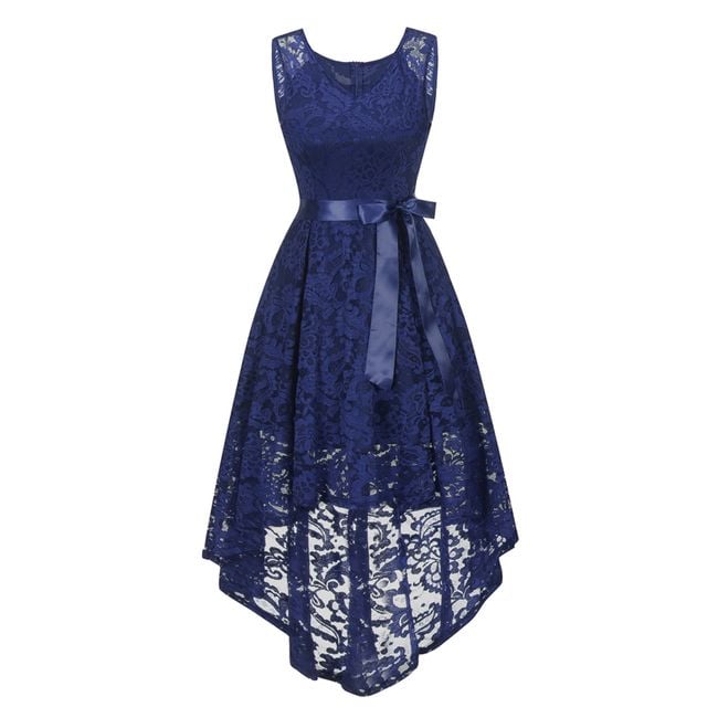The women's lace dress features an asymmetrical skirt and is tied with a decorative bow. You can choose from 3 colour options.