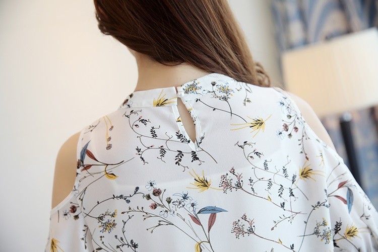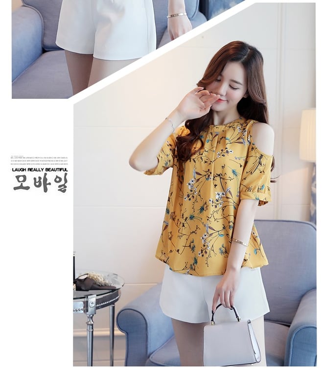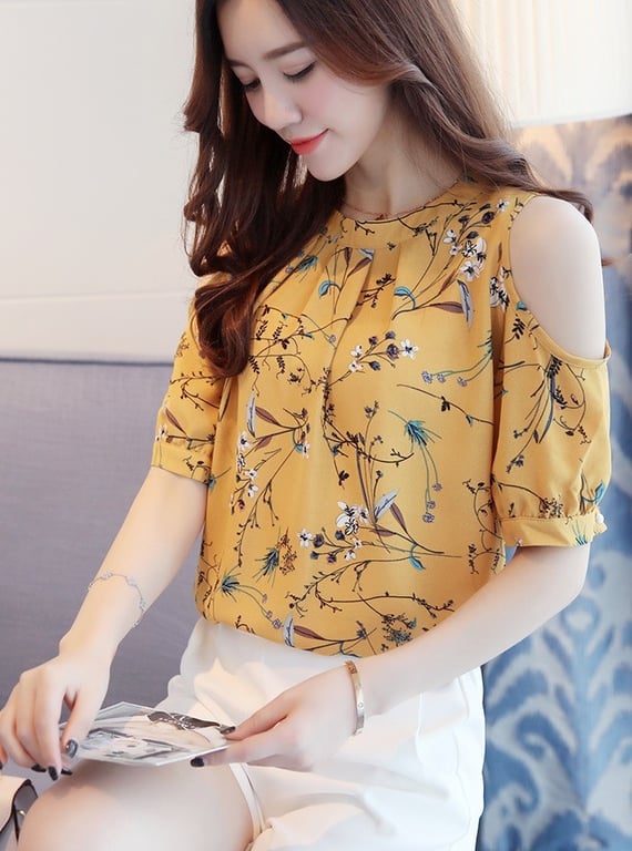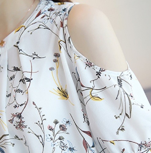 Beautiful women's blouse with a floral pattern and shoulder cut-outs. You can wear this blouse anywhere in the summer, and thanks to the soft material, you'll feel great in it.