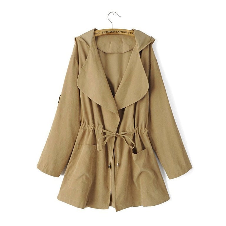 Women's stylish coat with a hood, pockets, and a drawstring tie at the waist. An ideal and flattering option for winter.