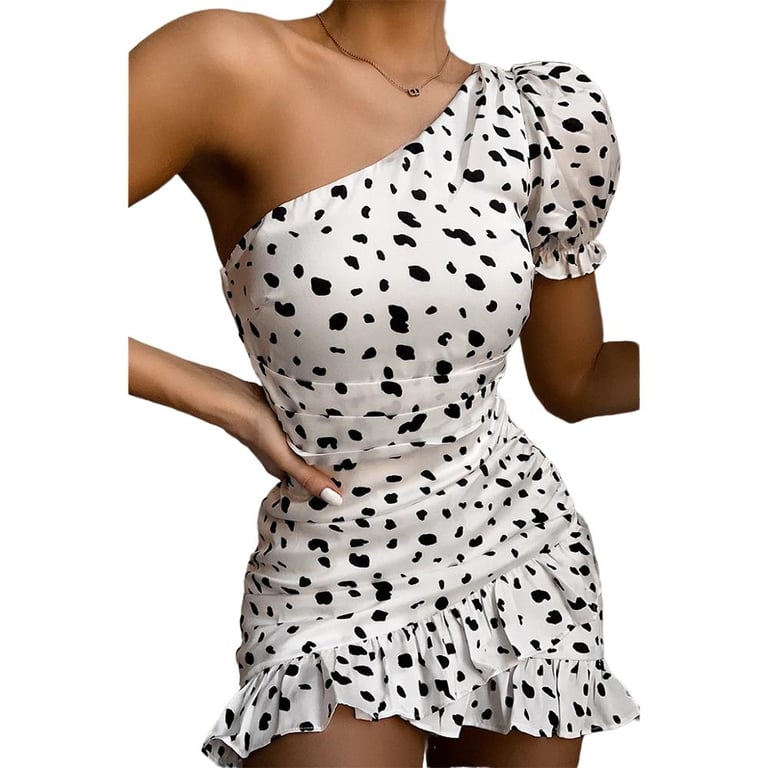 • Tags: one shoulder, printed dress, ruffles