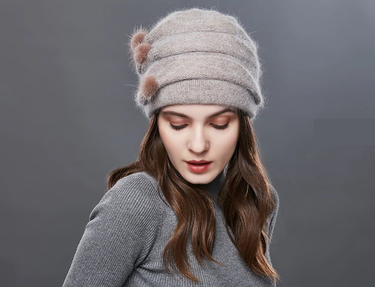 The hat is adorned with small pom-poms and stones.