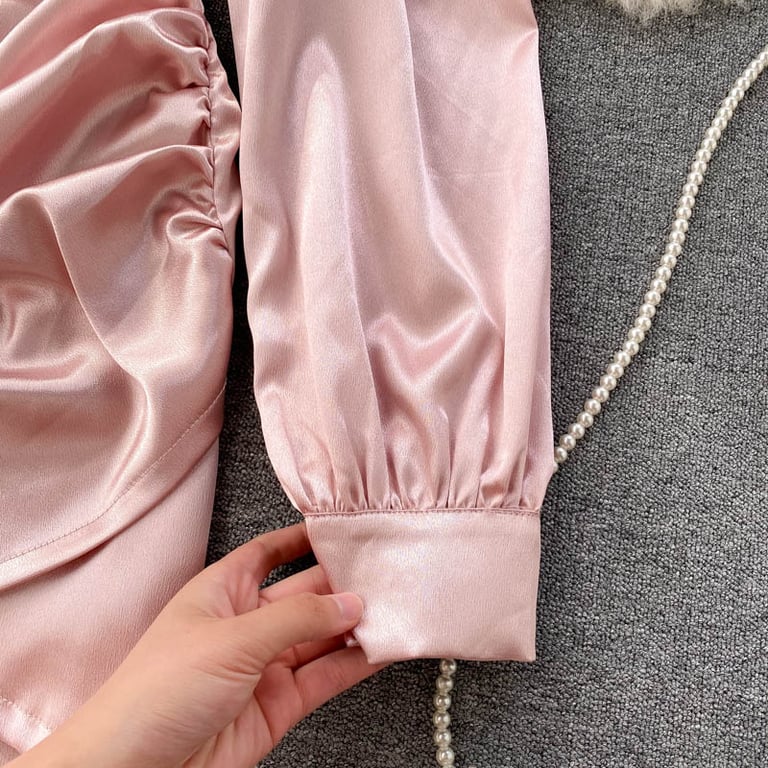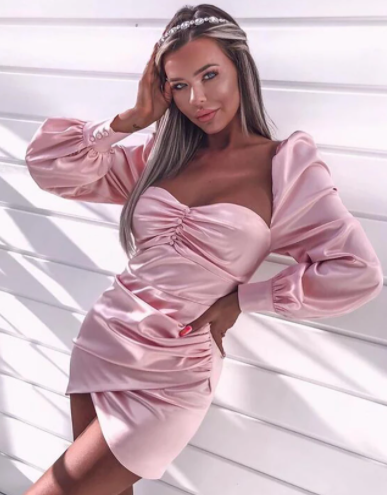 • Tags: Women's dress, satin dress, long sleeve dress, short dress, balloon sleeve, elegant, stylish, fitted