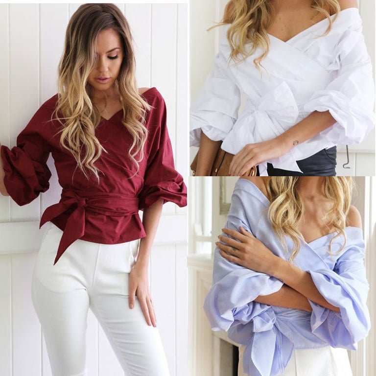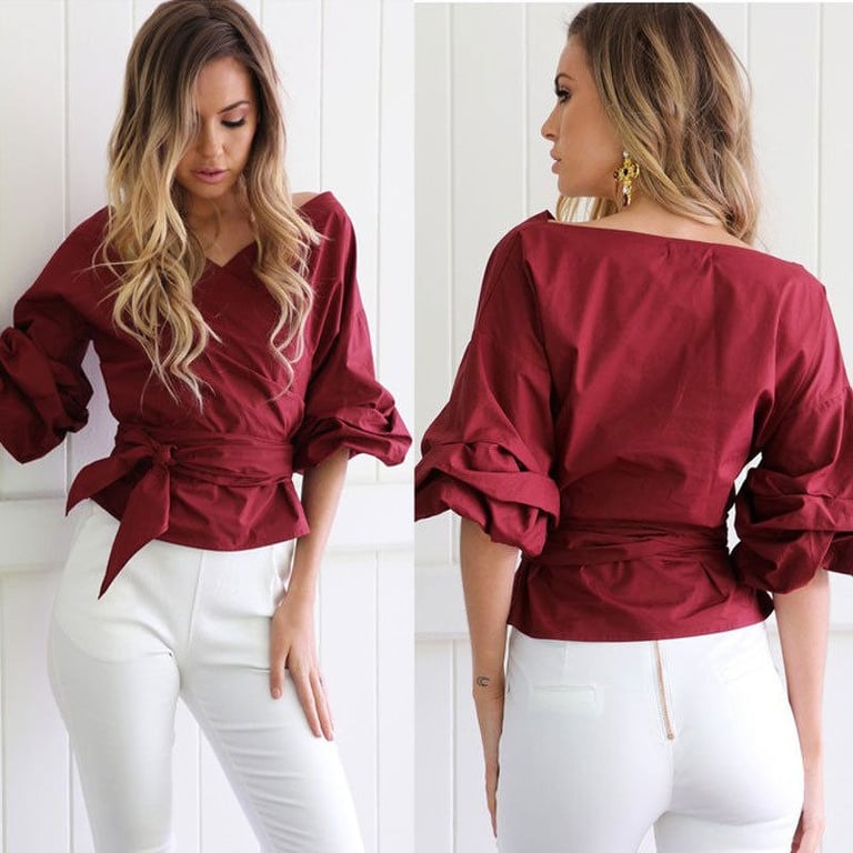 Women's shirt blouse with long balloon sleeves. Wrap-around with a V-neckline and a tie at the waist. Available in several colours.