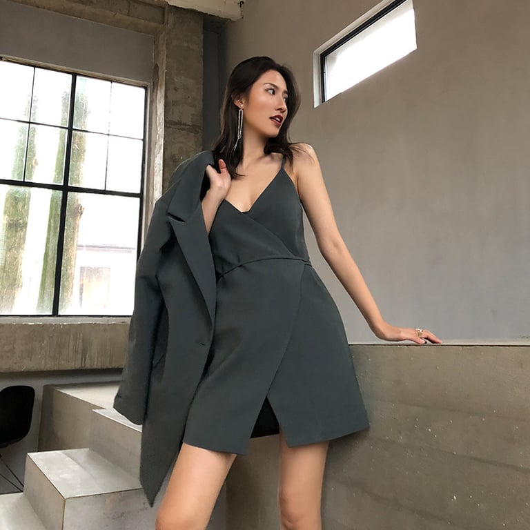 • The dark grey colour of both the dress and jacket ensures easy mixing and matching of these pieces individually.