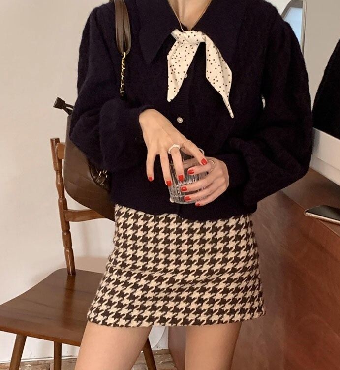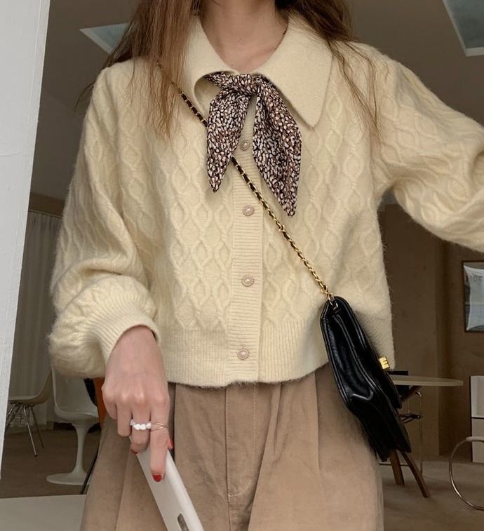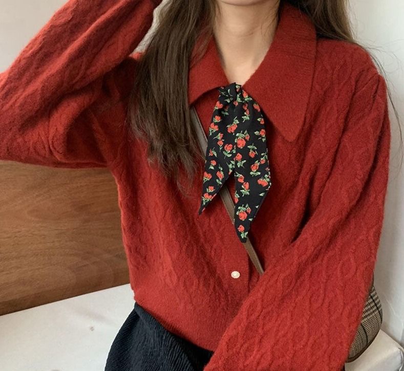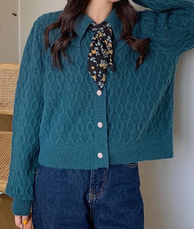 Elegant women's knitted sweater with buttons and a decorative scarf.
