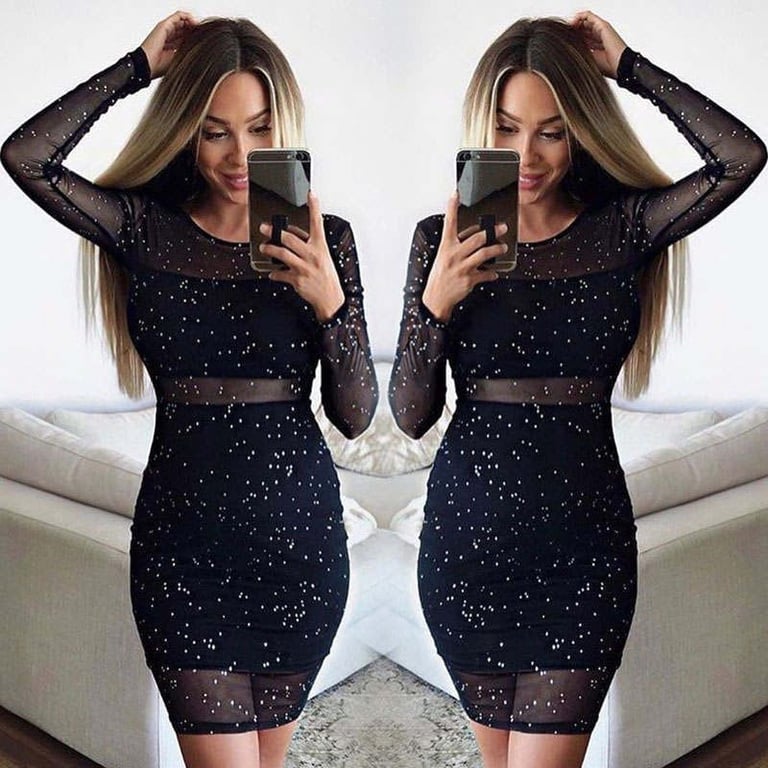 Women's short party dress with long transparent sleeves and sequin embellishments.