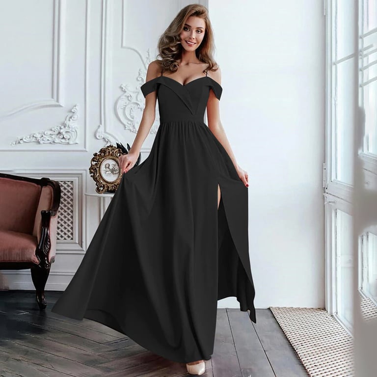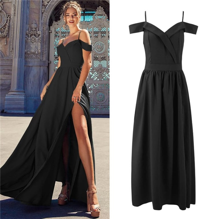Evening dress with a prominent neckline and straps. The cut is long with a slit at the bottom.