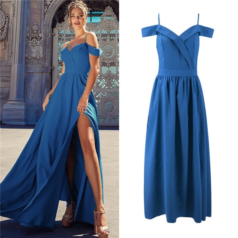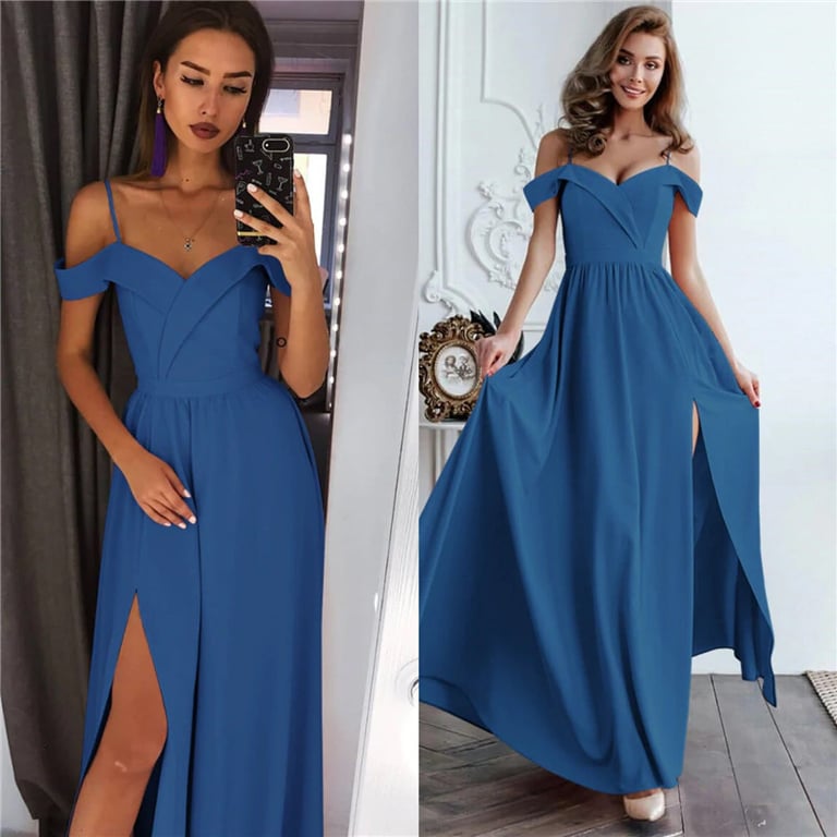 Evening dress with a prominent neckline and straps. The cut is long with a slit at the bottom.