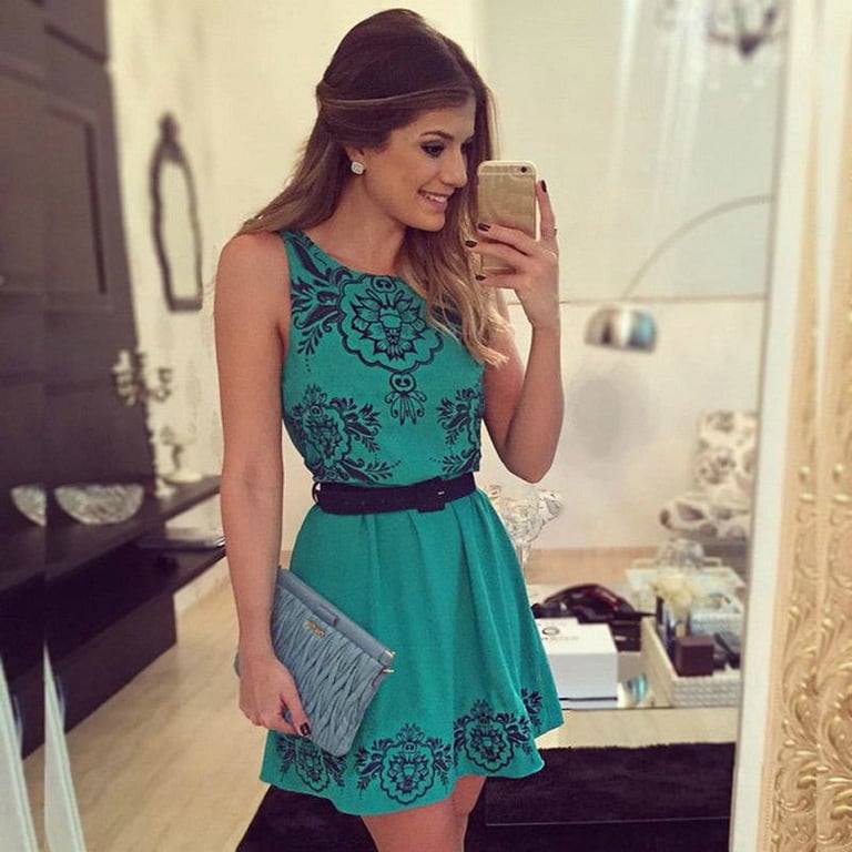 Women's evening dress with a print. Ideal for a ball or party. The dress is sleeveless with wide straps and a round neckline. A-line skirt with a belt at the waist.