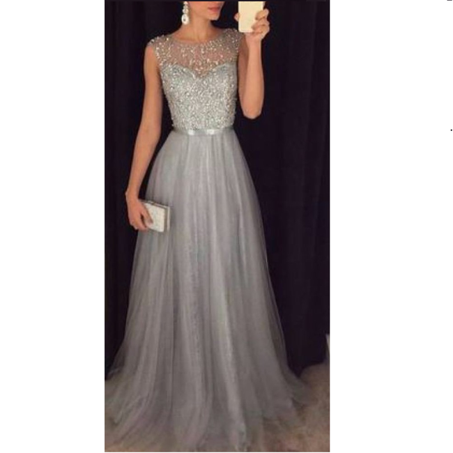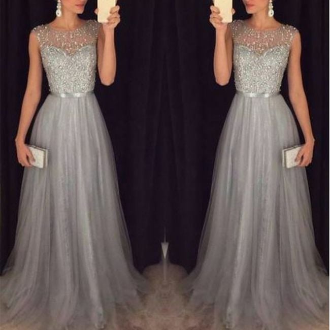 Women's evening dress features a sheer lace detail in the chest area.