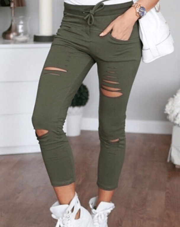 Women's sporty yet fashionable skinny trousers with holes. Ideal for the spring season. Available in 4 colours.