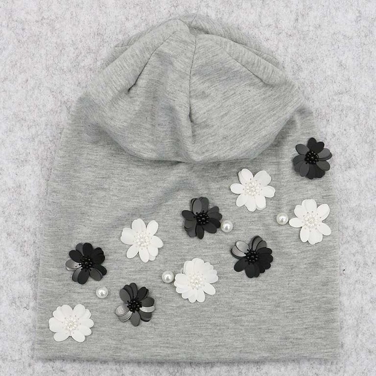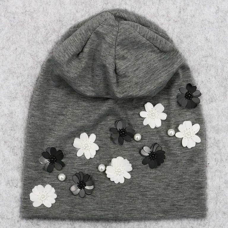 Women's beanie "Flower" Lightweight women's beanie with flower appliqués and pearl beads. Material: cotton, acrylic Head circumference: 52–60 cm