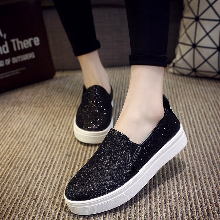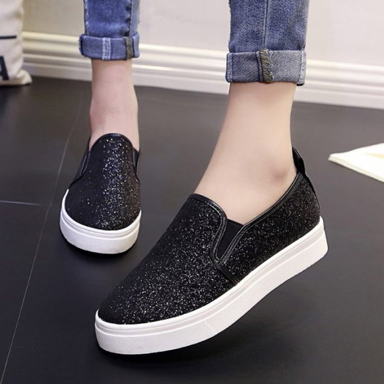 Women's slip-on trainers. Easy to wear with a rubber flat platform sole. Solid colour with glitter. Available in two variants.