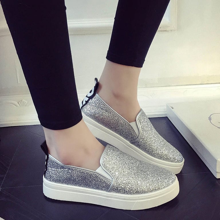 Women's slip-on trainers. Easy to wear with a rubber flat platform sole. Solid colour with glitter. Available in two variants.