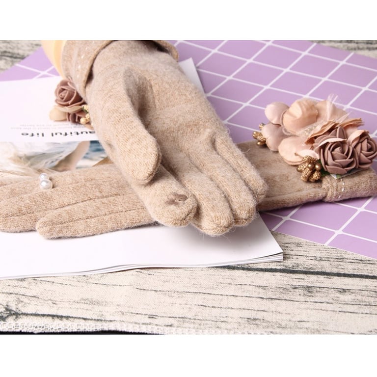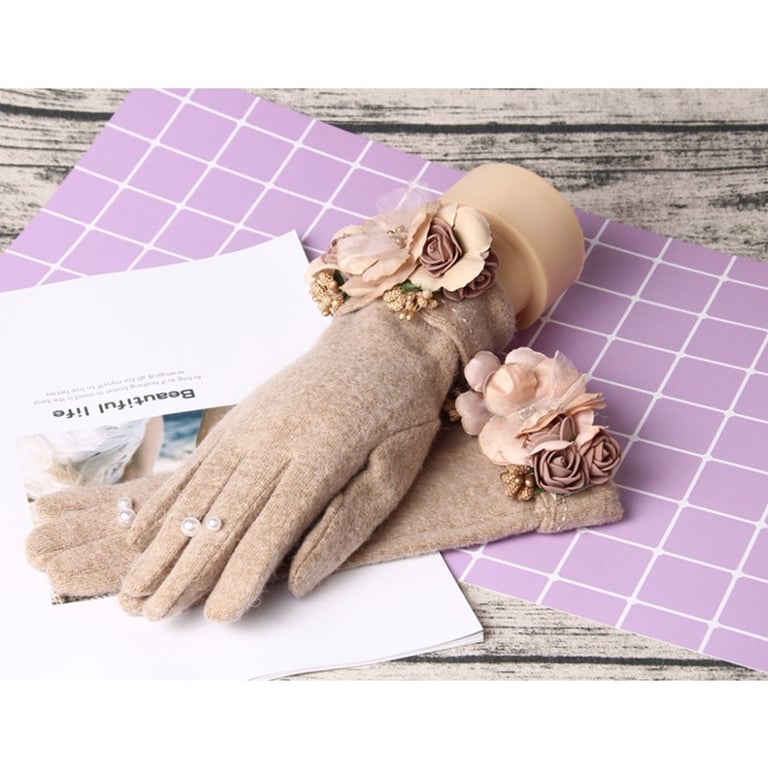 Women's winter gloves adorned with a floral accessory and pearls. Available in two colours.