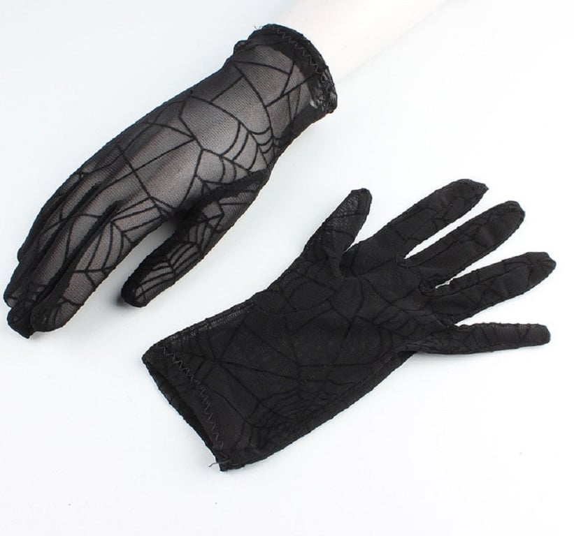 Black women's gloves made of translucent material with a spiderweb pattern.