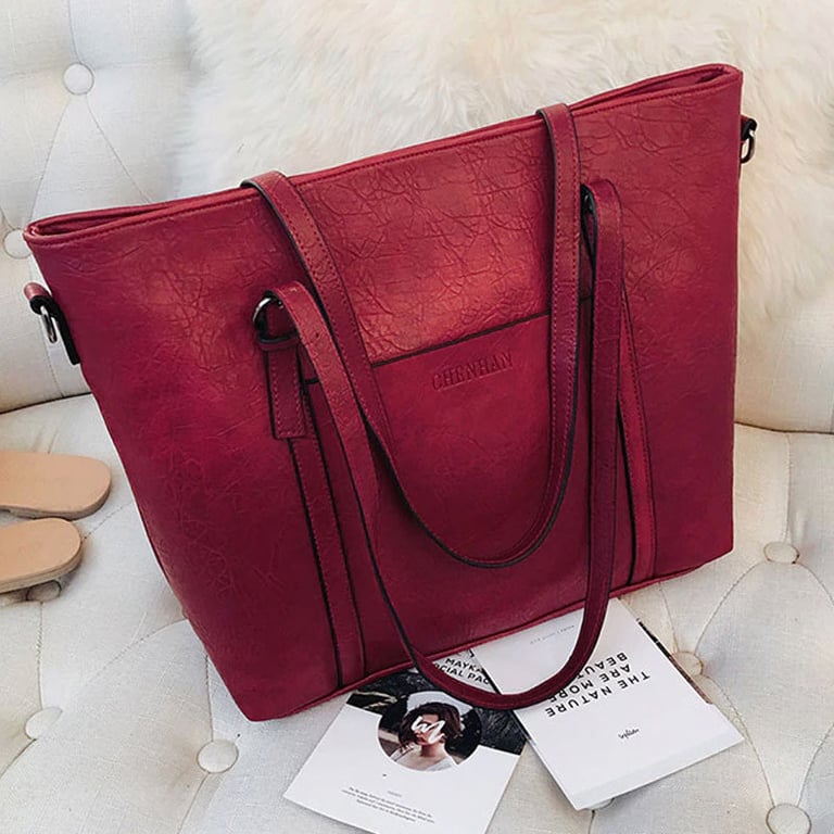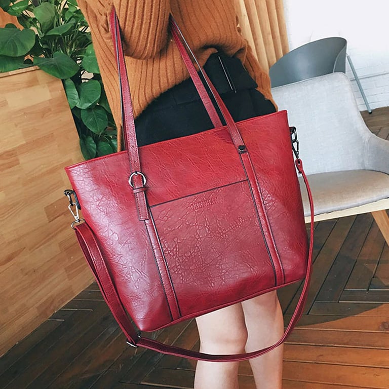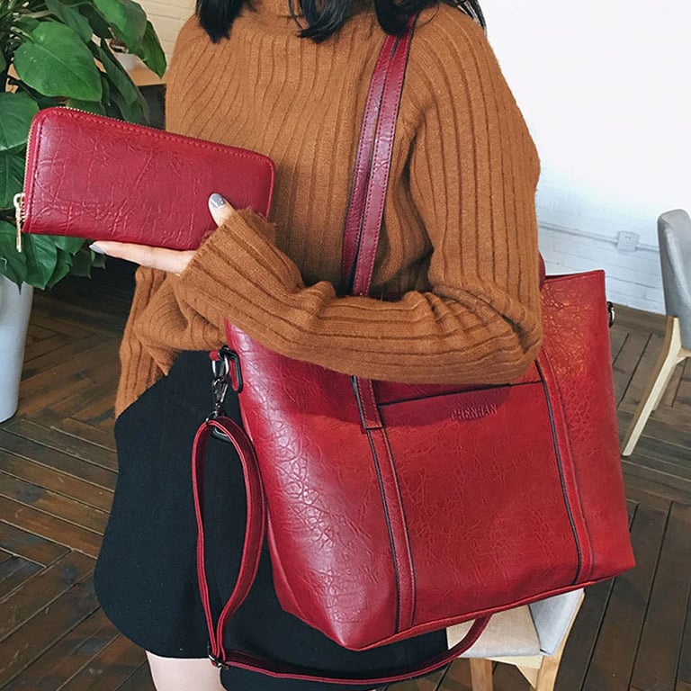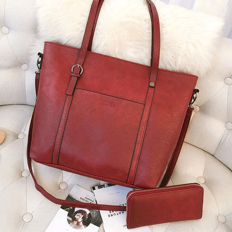 Large women's handbag and wallet with a leather look. The handbag features a large handle for carrying and a long additional shoulder strap, has a side pocket and a zip closure. Available in several colour options.