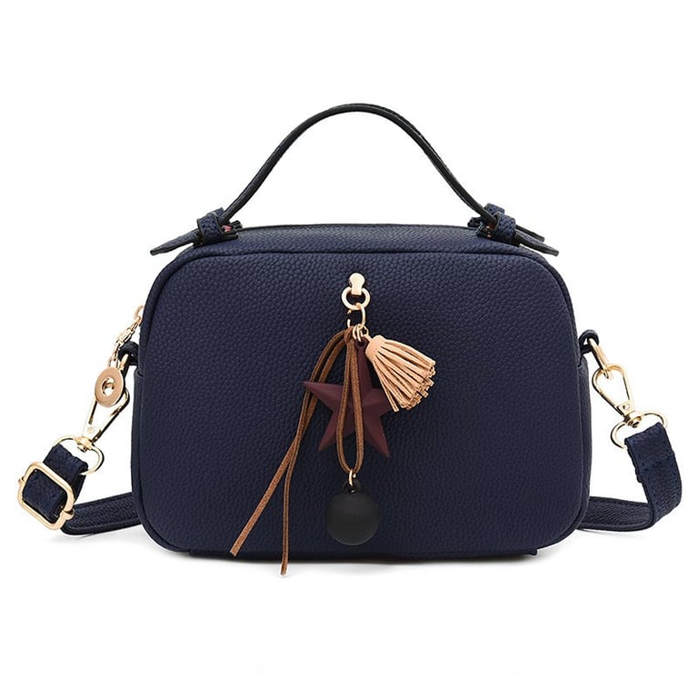 Women's handbag with embellishment and a long shoulder strap.