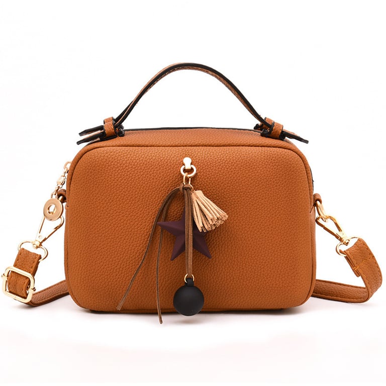 Women's handbag with decoration and a long shoulder strap.