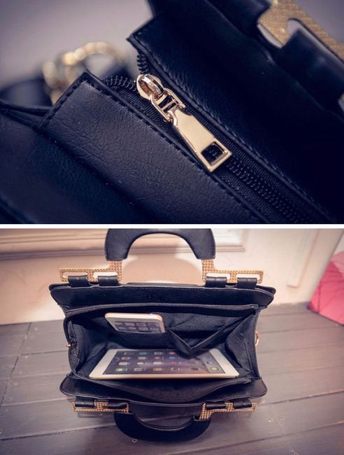Elegant women's handbag made of synthetic leather features a large storage space, enhanced with several smaller slots for documents and other small items. It is available in 9 colour variants.