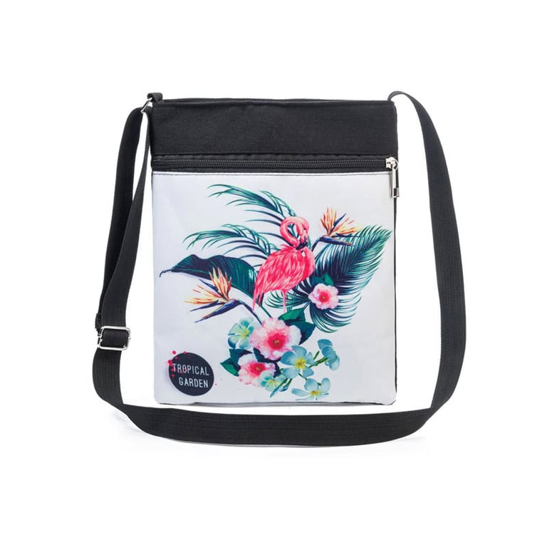 Women's handbag with a long adjustable shoulder strap. Large spacious pocket and a smaller front zip pocket. With a colourful print.