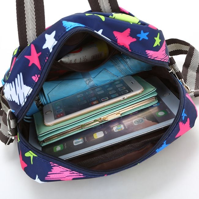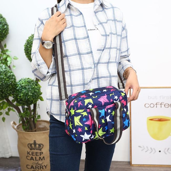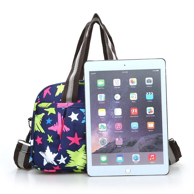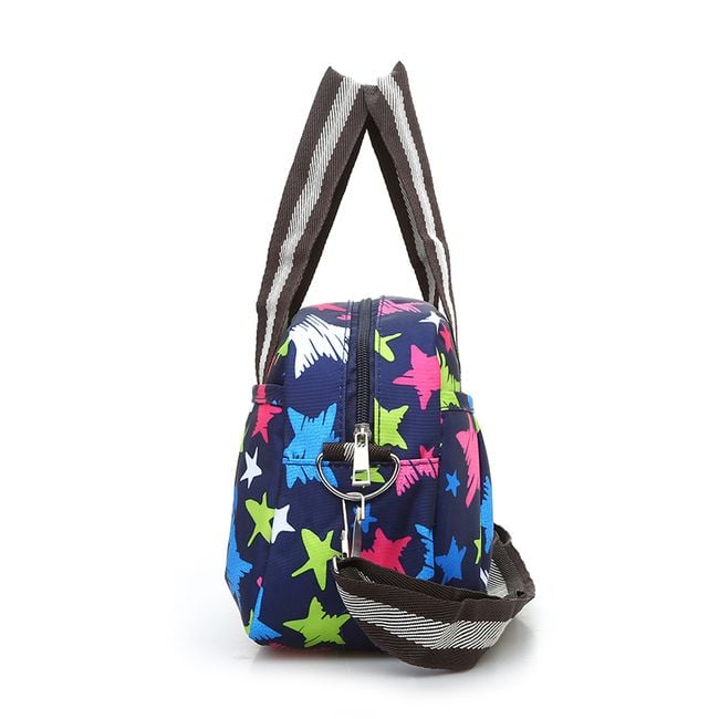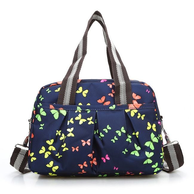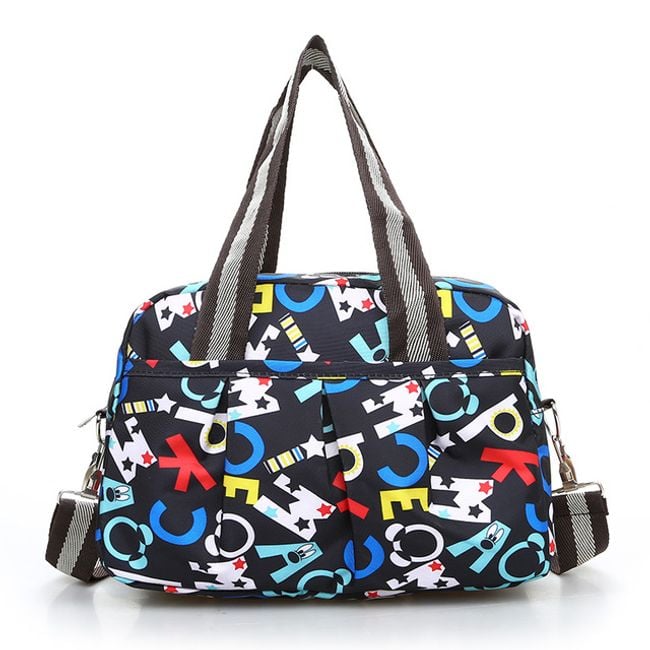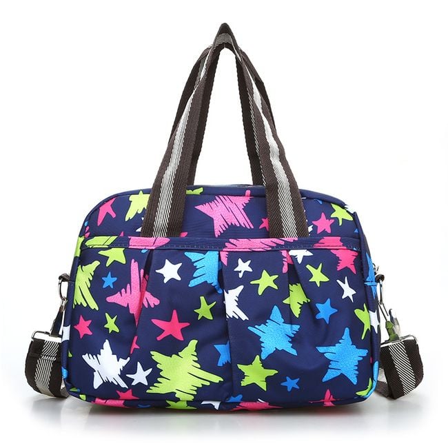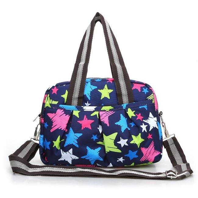 Women's handbag adorned with colourful patterns, featuring a detachable strap, one large zip pocket, and several smaller pockets.
