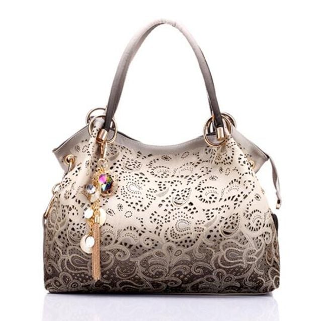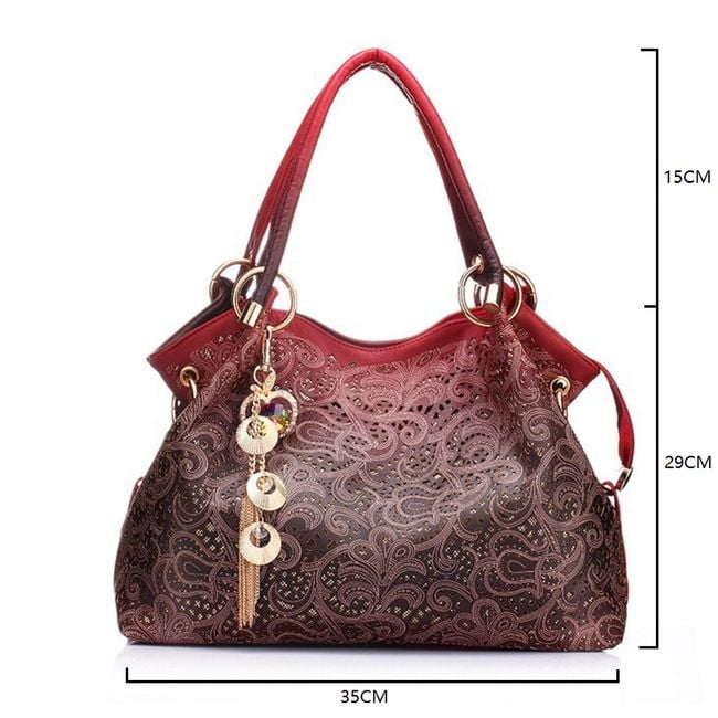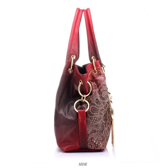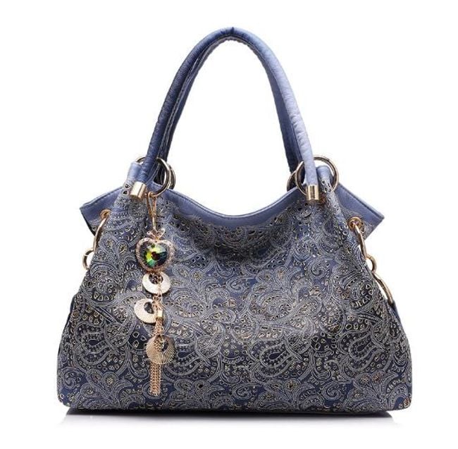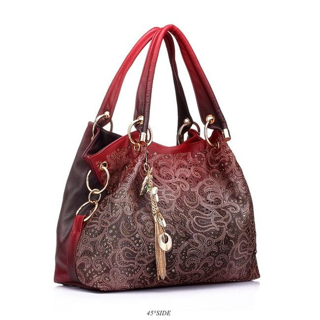 This beautiful handbag will look stunning in your collection. It features original embellishments. Additionally, beautiful charms are attached to one of the handles. You can carry the bag by hand or over your shoulder. It is spacious enough, so you don’t have to worry about your belongings not fitting in. We offer four attractive colours.