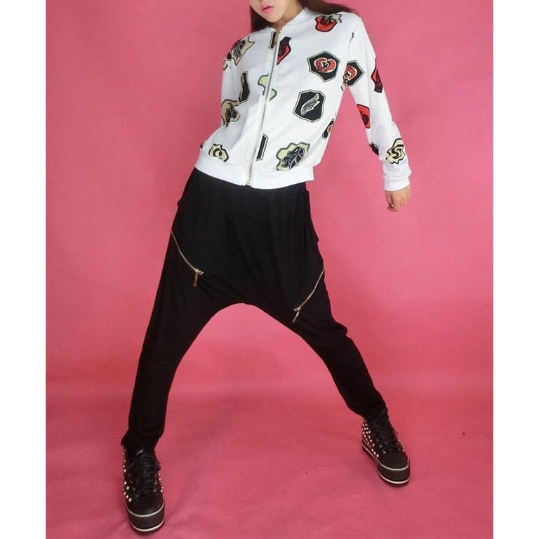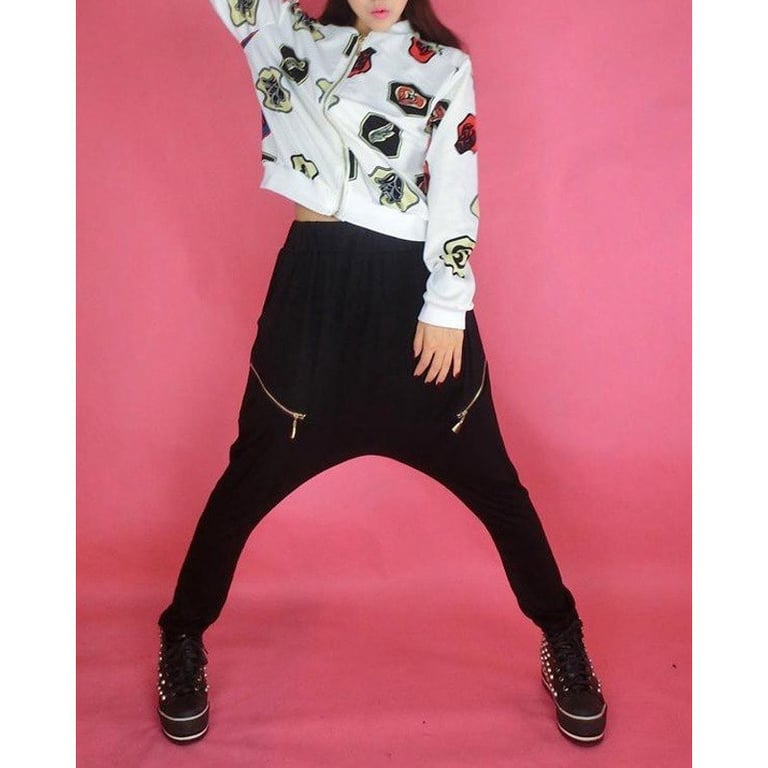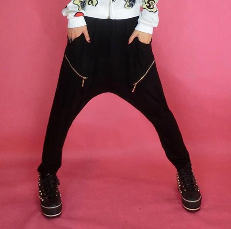 Women's joggers in black. The joggers have a harem cut with an elastic waistband. Tapered legs and two side pockets with zip fastening.