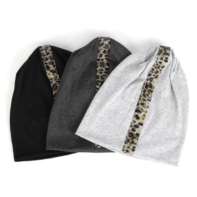 Women's beanie-style hat with a beaded application in a leopard design.