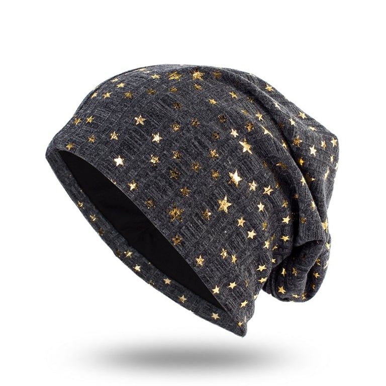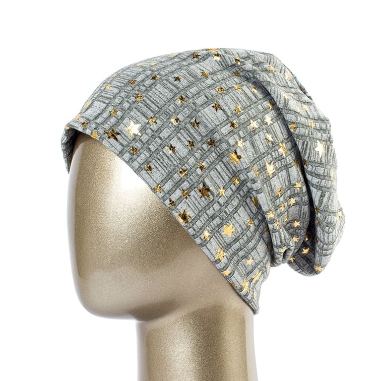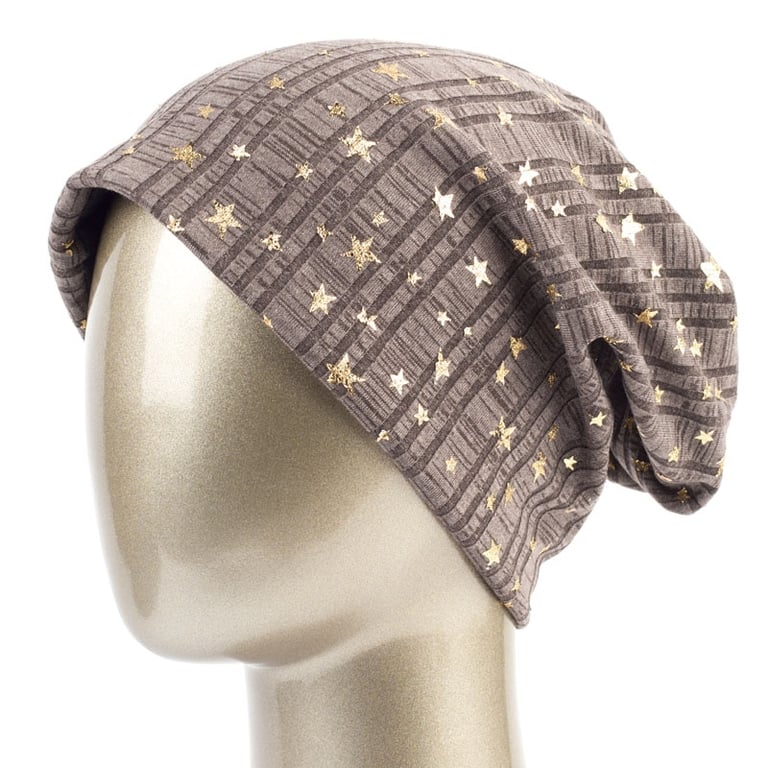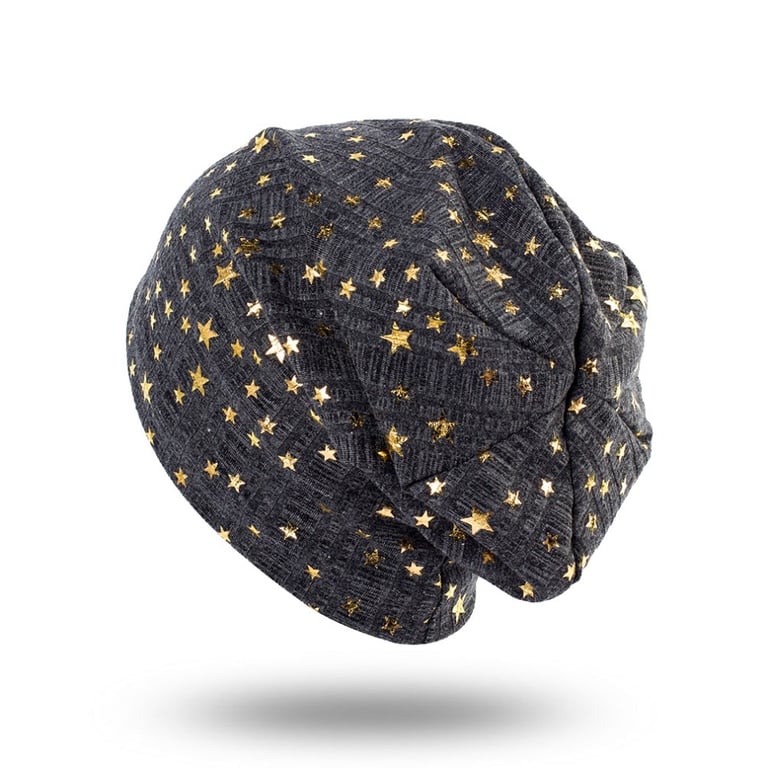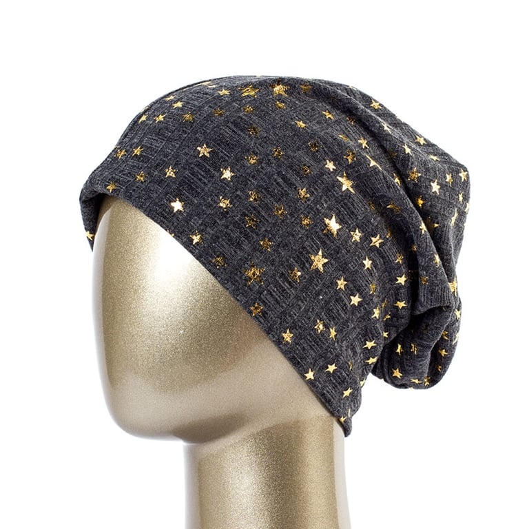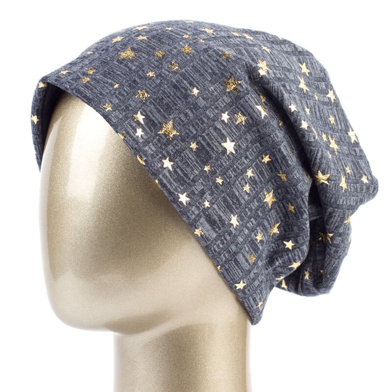 Women's hat with stars A beautiful lightweight hat ideal for spring and autumn. With gold-coloured star appliqués. Material: 65% polyester, 35% cotton Head circumference: 54–59 cm