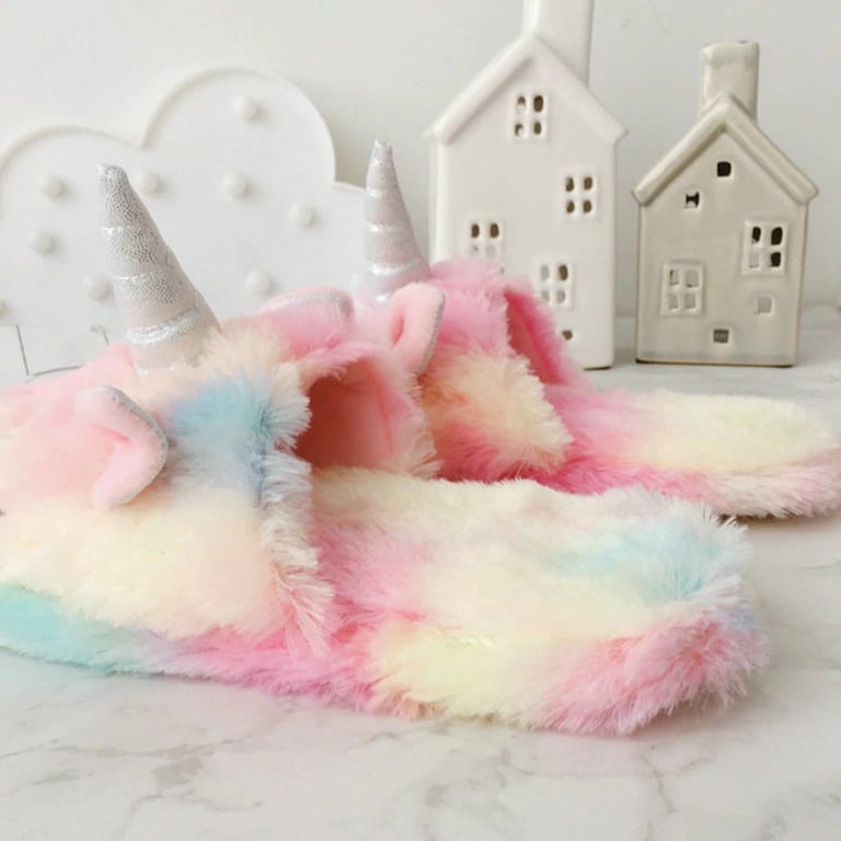 The slippers are in a colourful design and shaped like a unicorn.