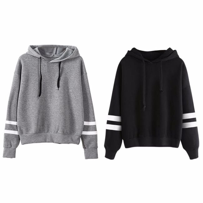 Women's hoodie with a hood and striped print on the sleeves. Thanks to its trendy loose fit, it will give you style and provide comfort all day long. Choose your size according to the measurements listed below.