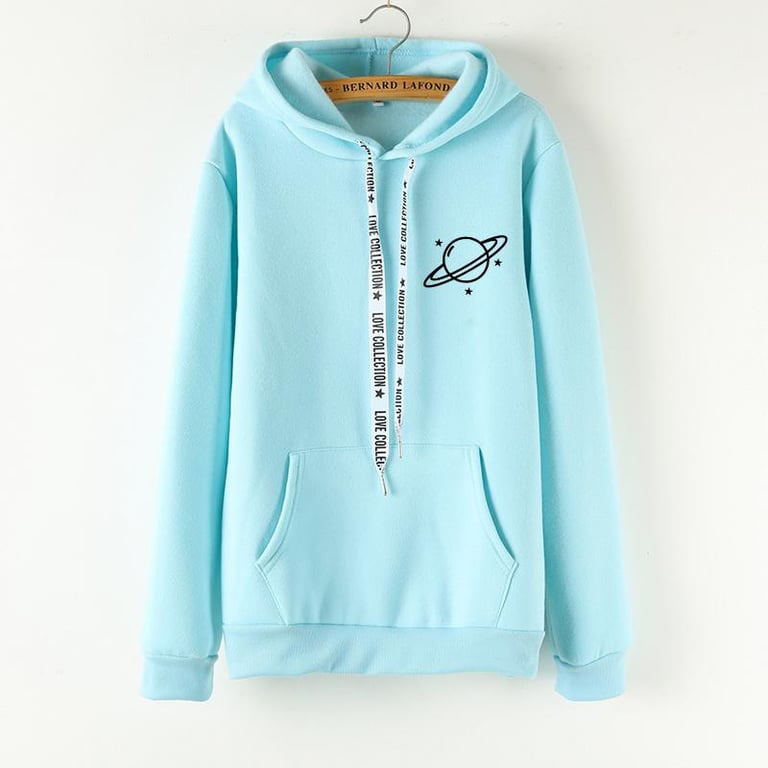 Women's pullover hoodie with drawstrings. The hoodie features long sleeves and a kangaroo pocket. It has a space-themed print on the front. Available in multiple colour options.