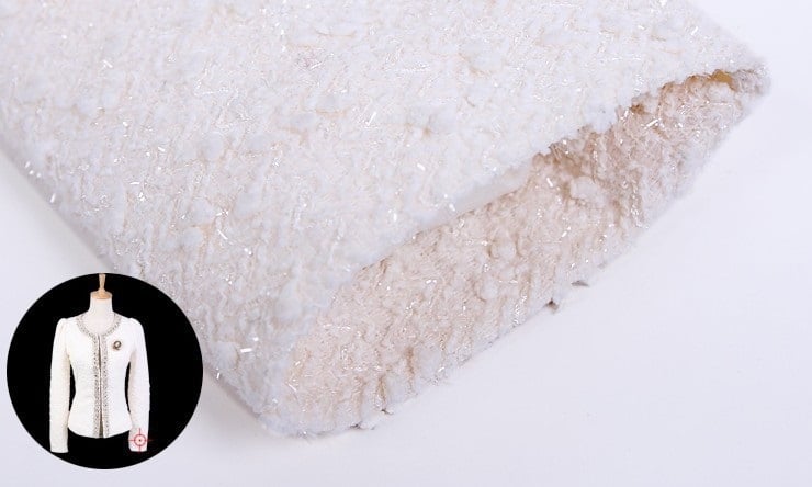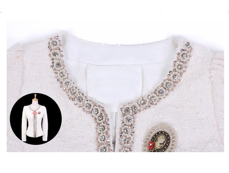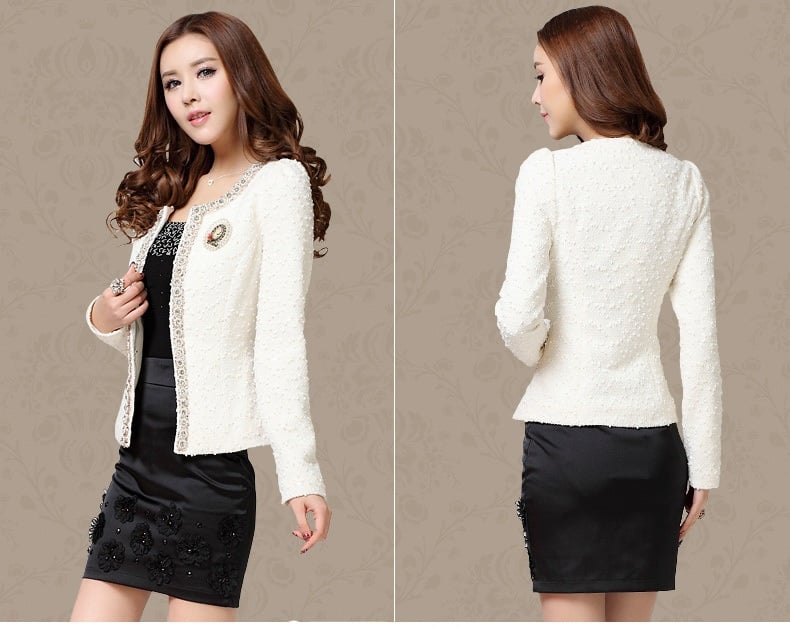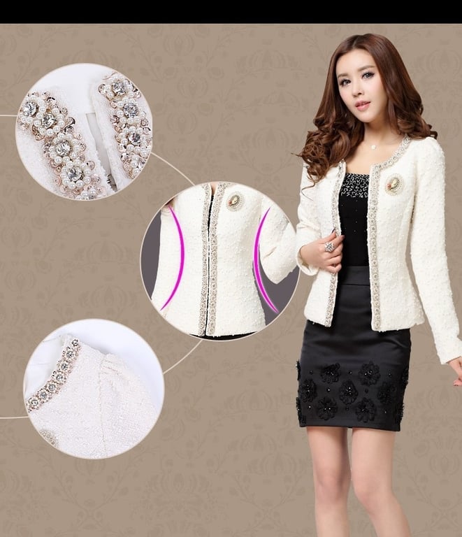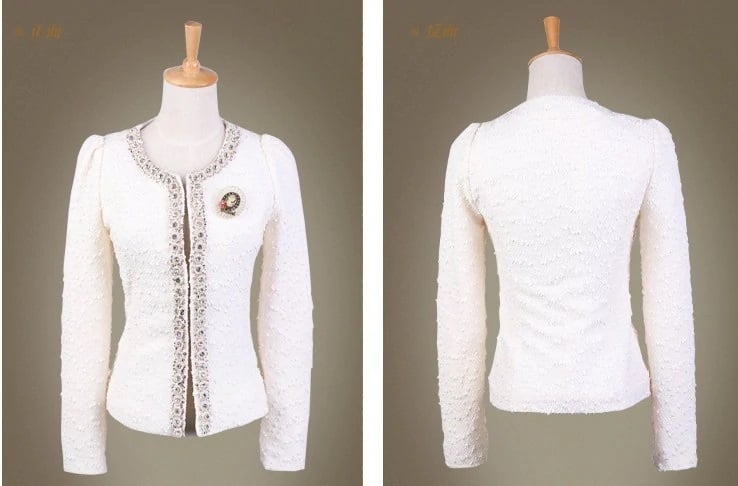 The jacket is very elegant and is suitable as an accessory to dresses or skirts, fastening with small hooks.