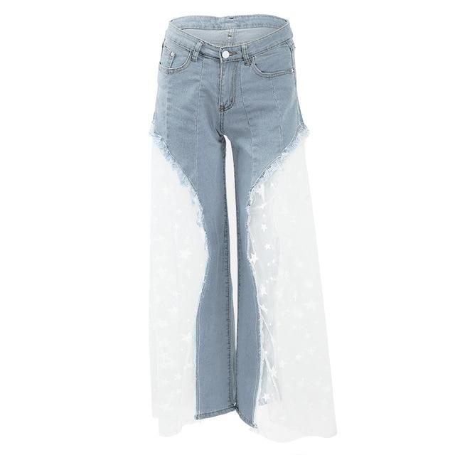 The denim trousers are combined with embellished mesh. It is covered with stars. The trousers fasten with a zip and a button.