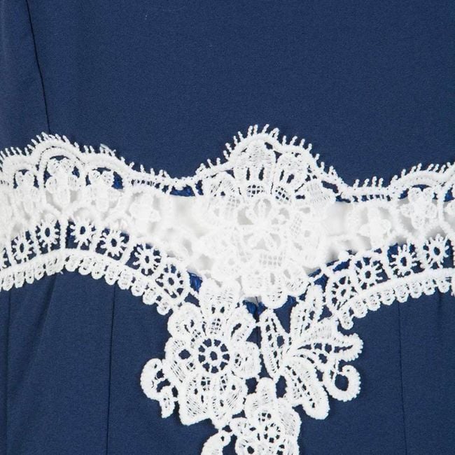 The strapless women's jumpsuit features a covered neckline and is adorned with delicate lace at the waist.