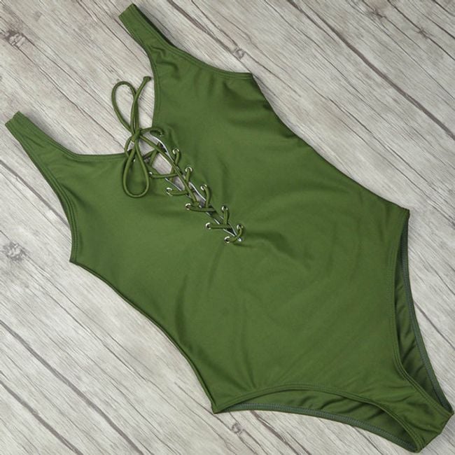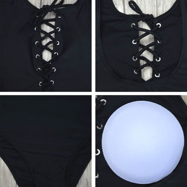 Women's one-piece swimsuit features a V-neckline with delicate lacing. Available in 2 colour options.
