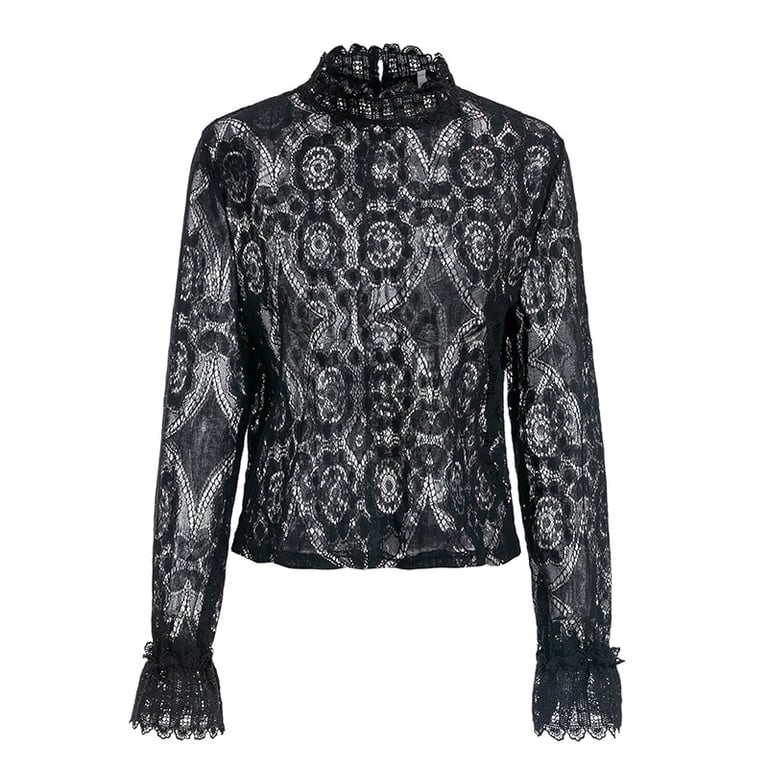 The blouse is transparent and pairs well with a simple tank top or bralette underneath.