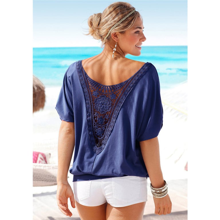 Women's loose-fitting top with short sleeves. Elastic waistband. Back neckline with lace detailing. Available in multiple colour options.