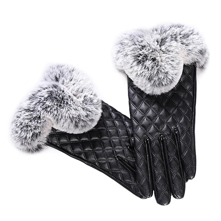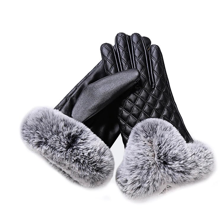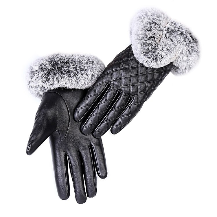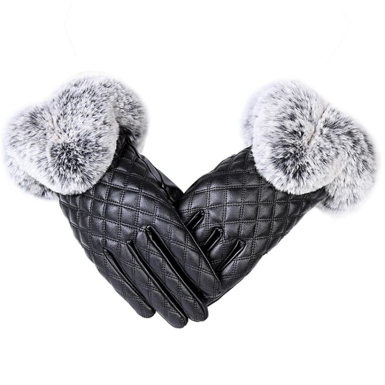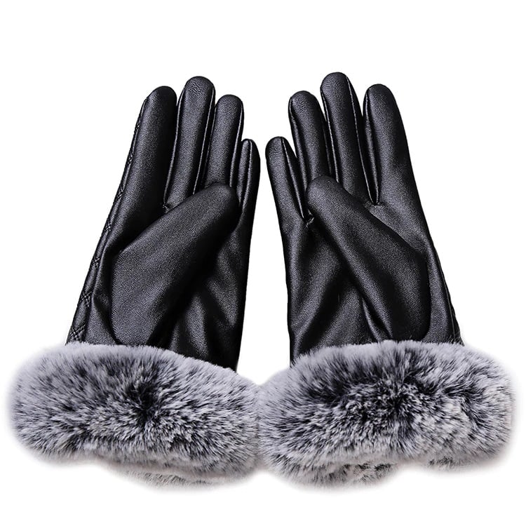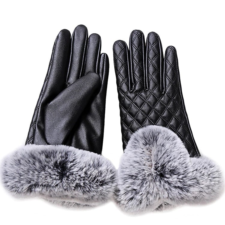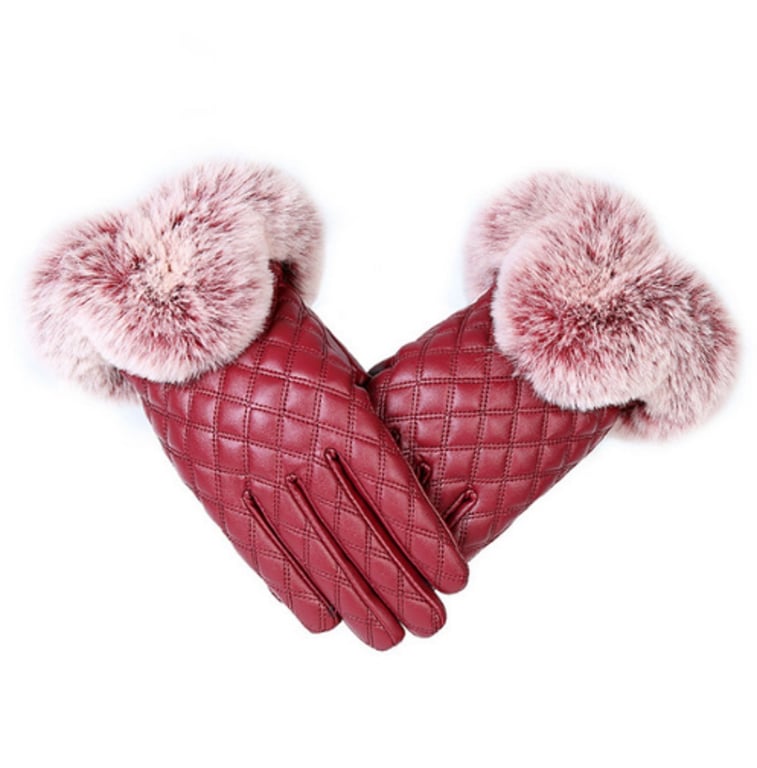 Women's leather gloves adorned with stitching and fur, designed to protect your hands from the cold.