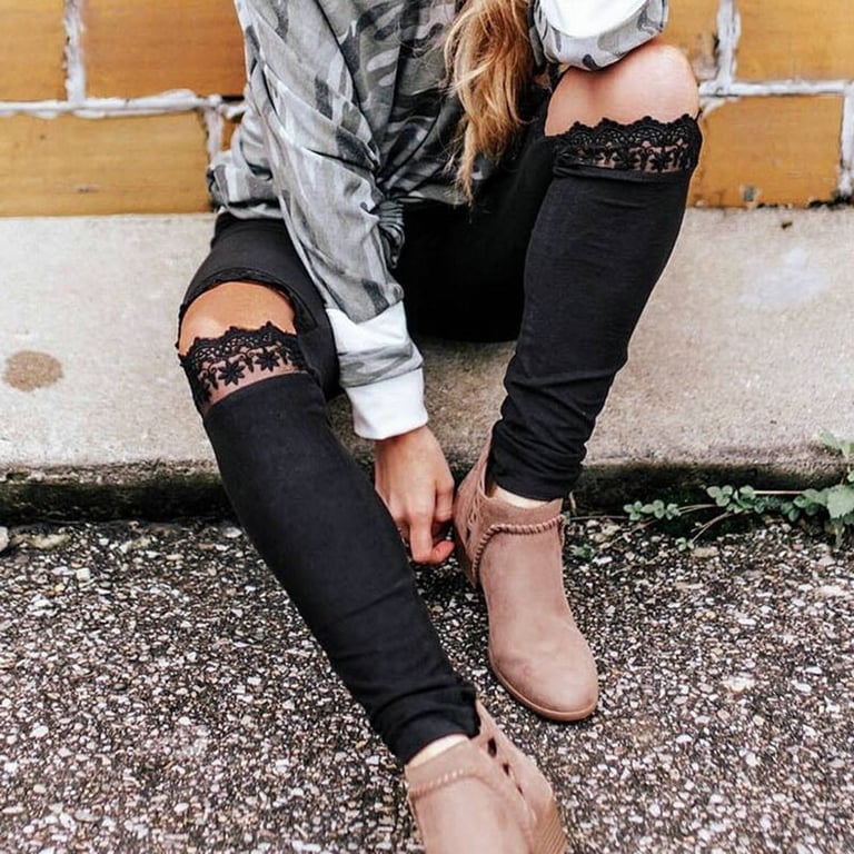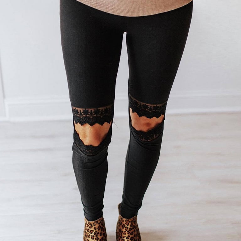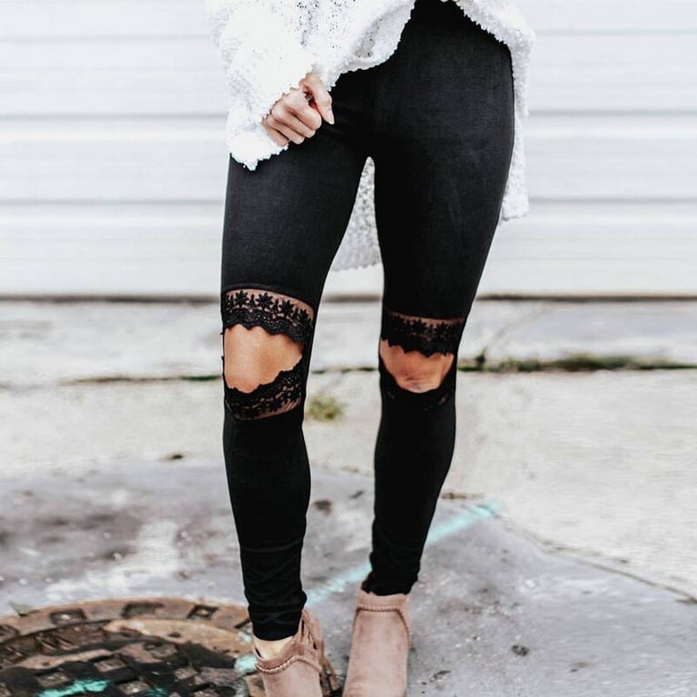 Women's leggings with a high waist and narrow legs. Lace decoration with knee openings. Elastic material.