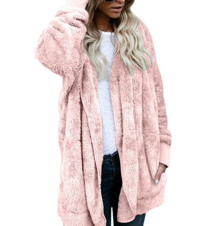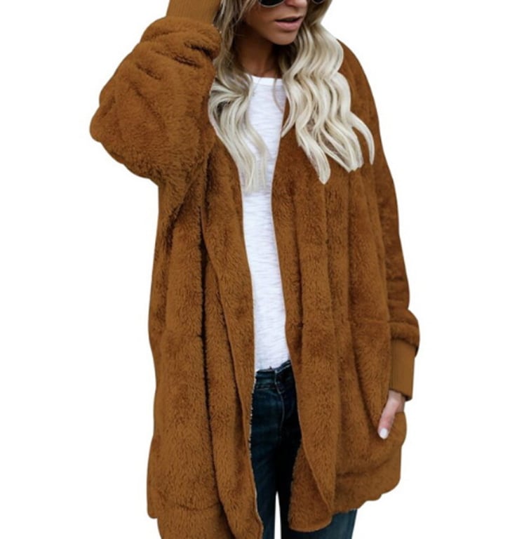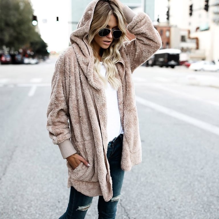 The jacket has a loose fit and does not fasten, featuring a hood and pockets.