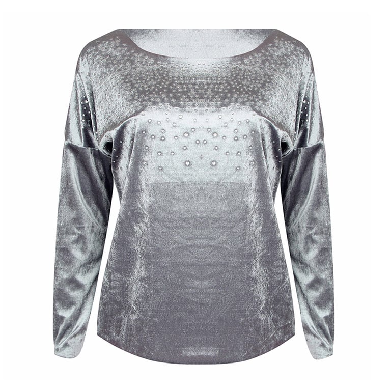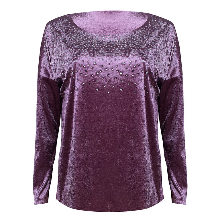 Women's solid-coloured sweater adorned with rhinestones. Fashionable round neckline with dropped shoulders.